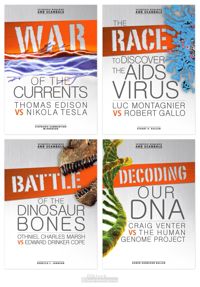 Ah, the creative process. A process in which research, indecision, dislike, burnout, client decisions, deadlines, breakthroughs, and triumph all are a part. This series cover project had all of that, in spades. Multiple times. It was a trial, but in the end I’m quiet happy with the way these have turned out. These books are a look at scientific discoveries & ideas and the rivalries between scientists who furthered these ideas. Scientists aren’t always the nicest of people, nor do they always play nicely with others…
