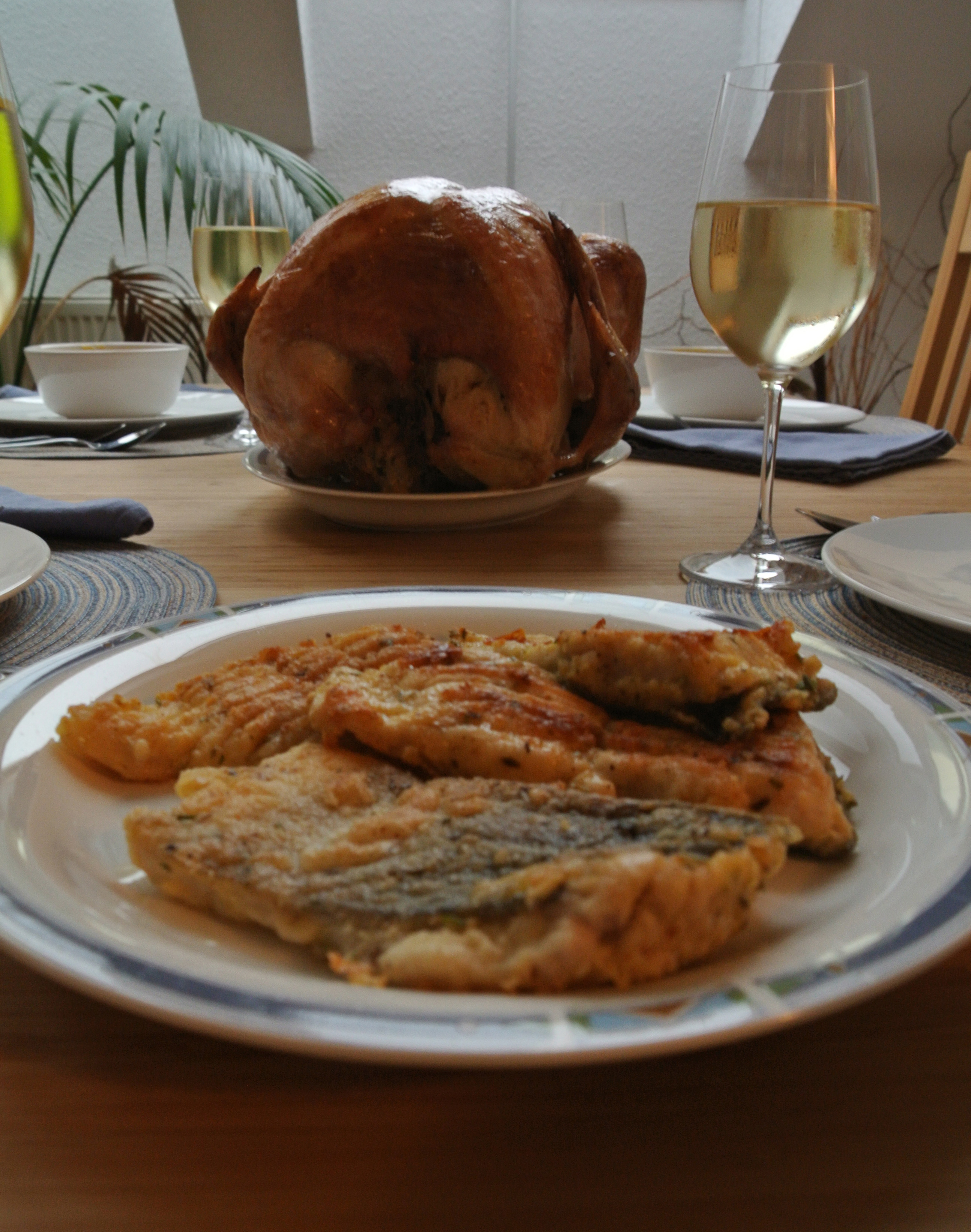 4) Christmas dinner at my brother’s place: traditional American turkey, and a traditional holiday dish of the area—fried carp. In case you’re wondering, fried carp is bland and greasy. In the glass, a typical wine of the region, gewurtztraminer.
