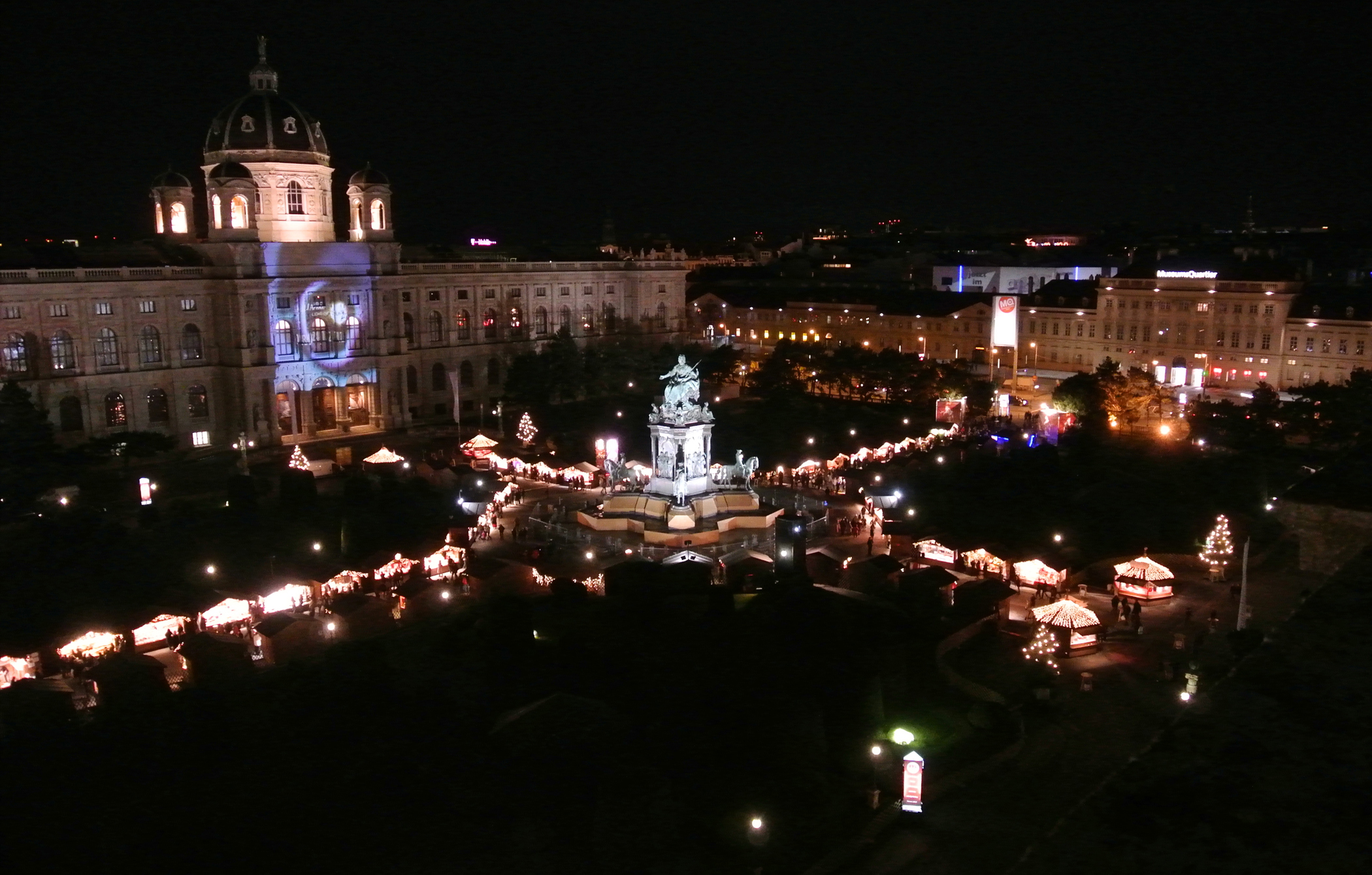 5) View of a Christmas market bei nacht and the Kunsthistorisches museum across the plaza, taken from the roof of the Naturhistorisches museum.