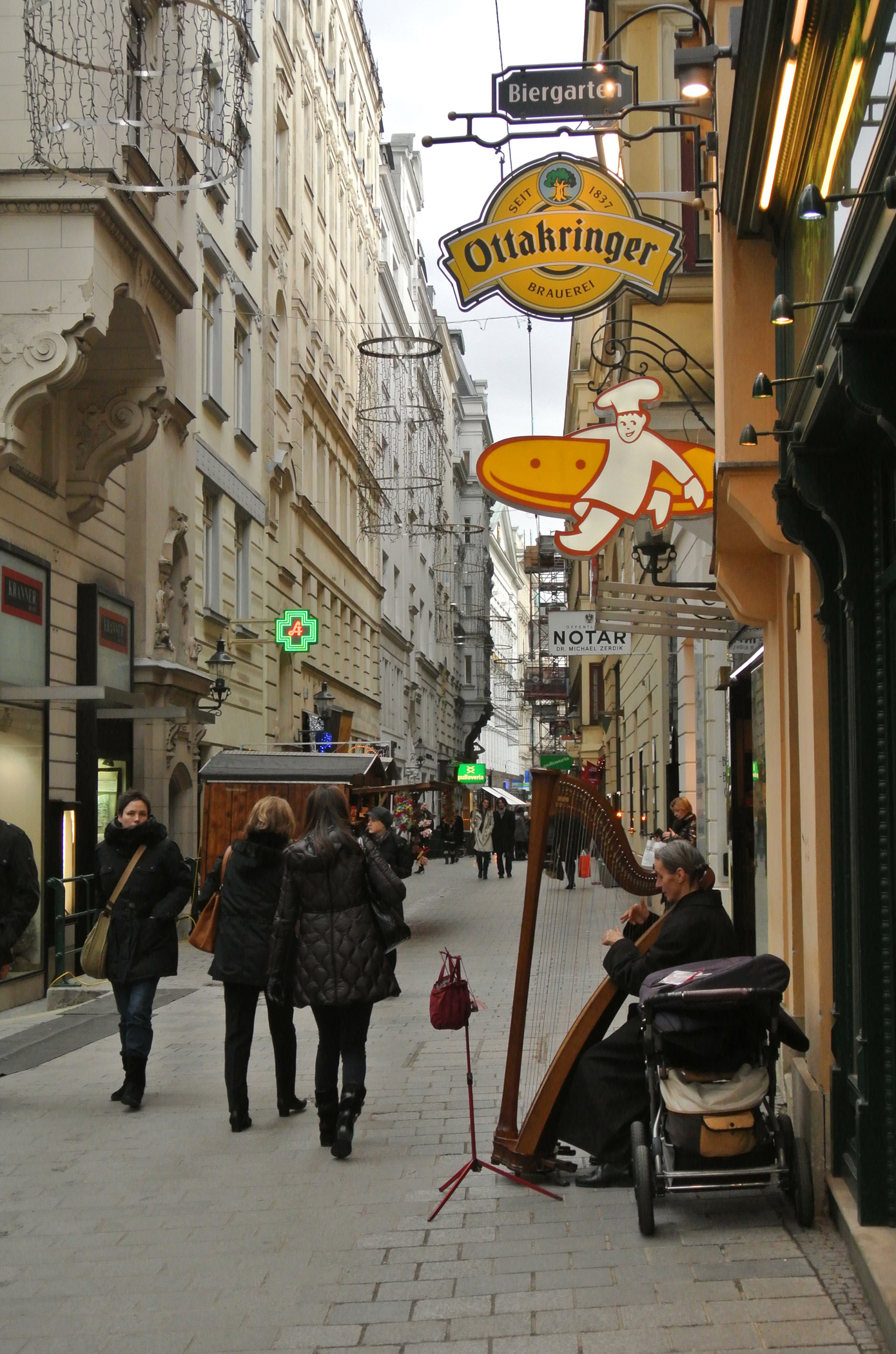 9) Fairly typical street scene for this city, believe it or not. Beer, bakery, and street harpist.