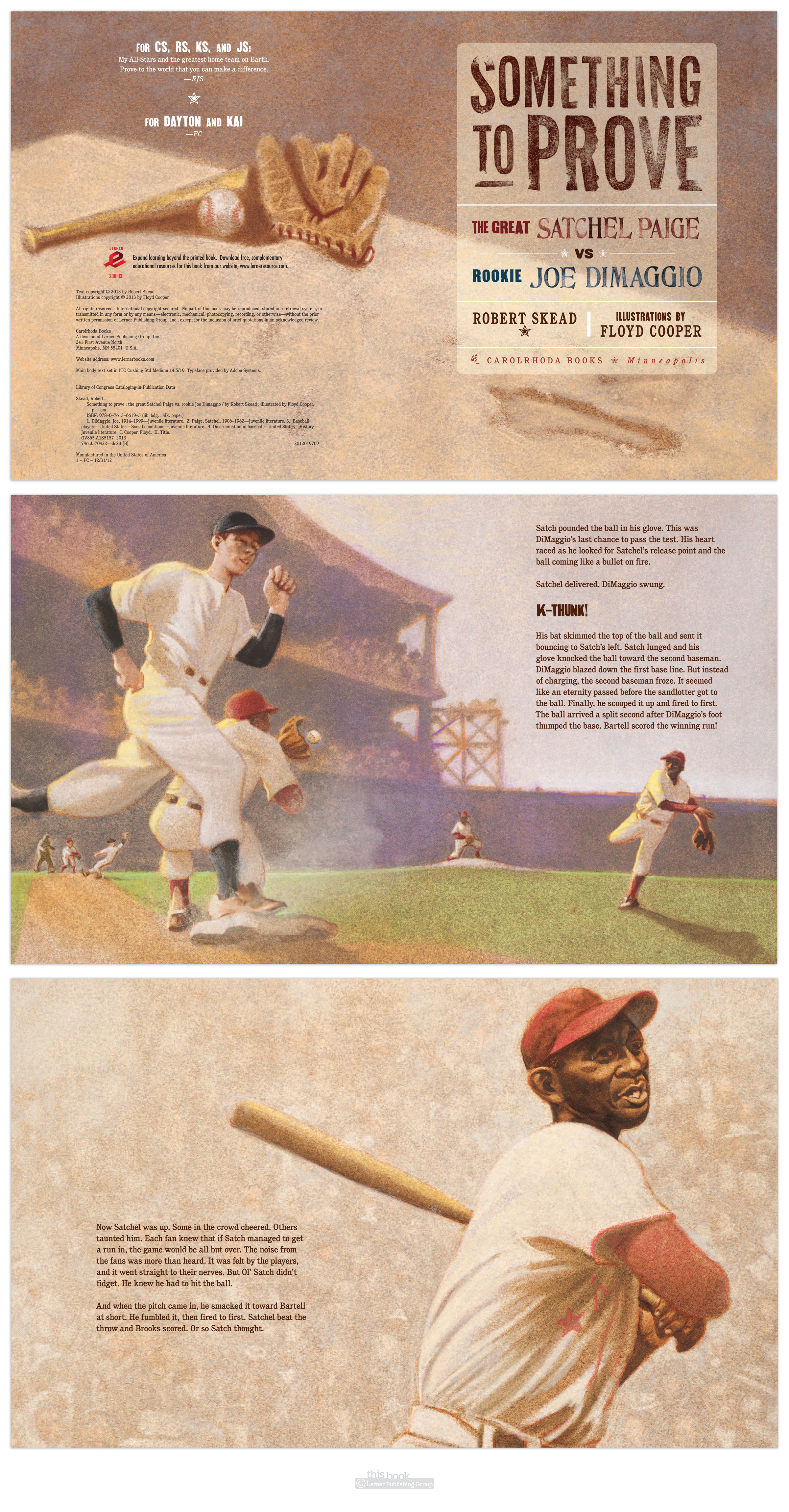 When you get to work with artists like Floyd Cooper on gorgeous picture books about baseball (Something To Prove by Robert Skead, published by Carolrhoda Books, 2013), what the reader should notice is the story and how well the art & words complement each other to tell the story. On this project my job as designer and art director was to help guide the artist to the proper feel, content, and composition while leaving room for text on the page—not to add a bunch of self-serving design elements that distract from the story. Anything added needs to match the feel and the idea. Which is why the main text in the book is simple & legible, and the display type resembles old baseball game posters—to enhance the story & the experience, help the reader travel into the time & place.