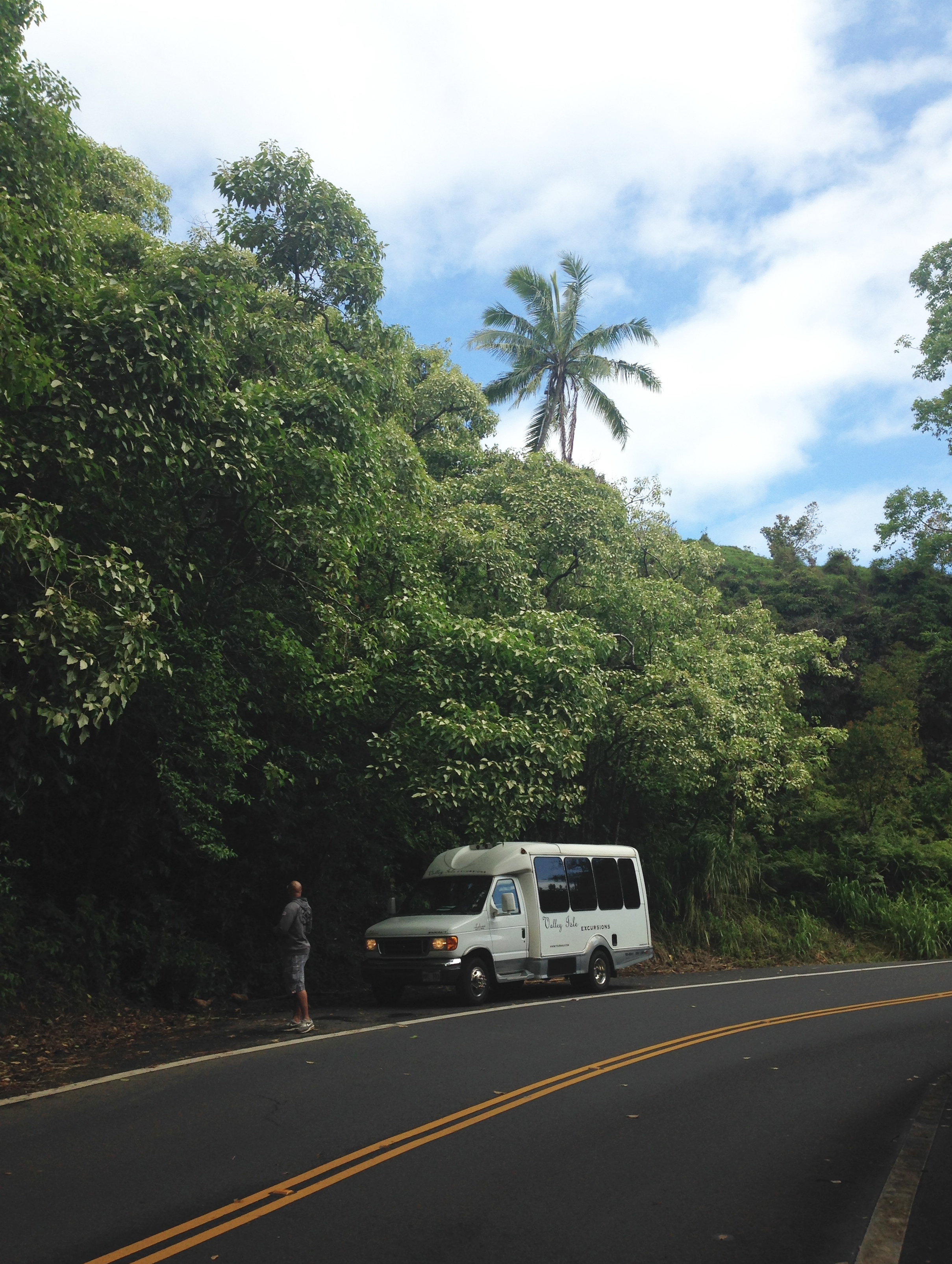 (This is the only picture I have of our tour van & guide on the Hana Highway on Maui. This was a 12-person vehicle. The largest group I would probably ever recommend going anywhere with. Any larger, you spend more time getting on & off the bus than seeing anything off the bus.)