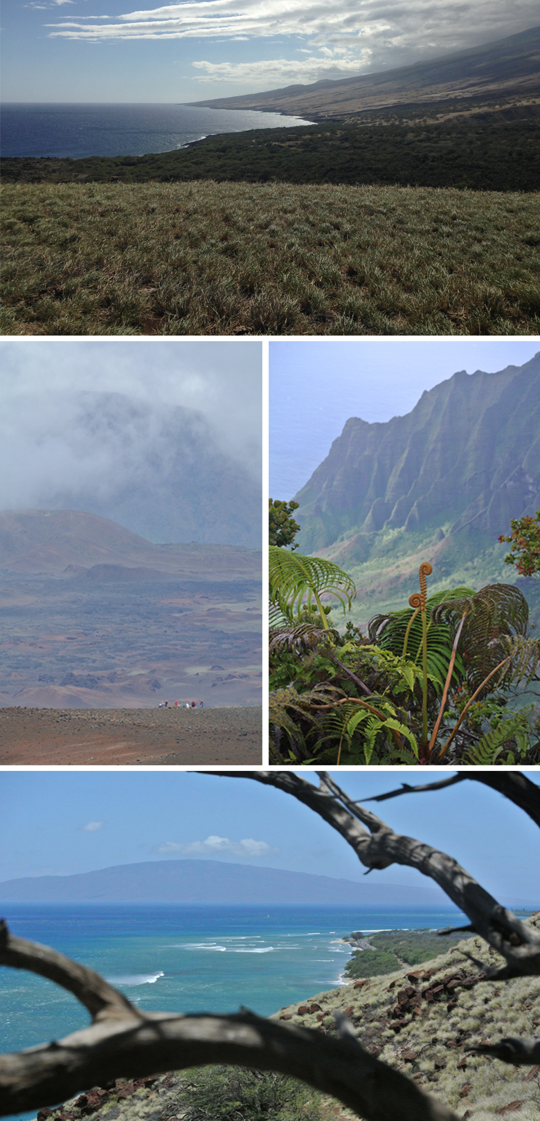 Windswept Kaupo, the expanse of Haleakala crater above the clouds, a partial view of Mt. Waialeale through drizzle, halfway up the breezy Pali trail.