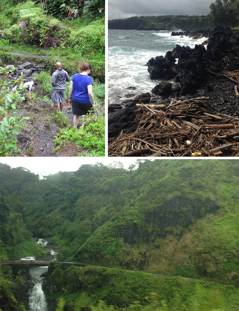 Top left picture by Carrie. Me headed down a hill, Keoni watching another one of our crew, Matthew, scramble down same hill. Top right, sharp lava rocks & waves. Bottom, part of the Hana Highway. Forgive the photo quality please, I brilliantly forgot my better camera’s memory card at home.