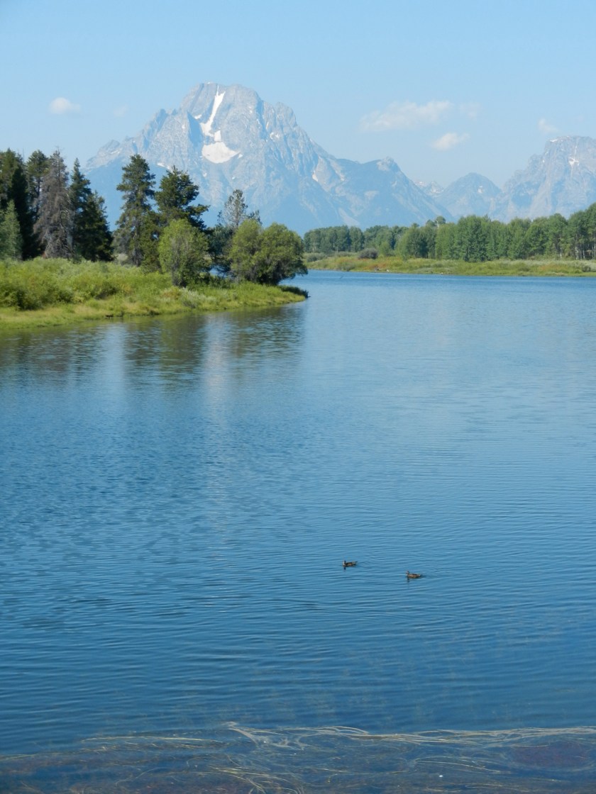 The Grand Teton you know of photographs, the craggy jutting peaks of the Teton Range, are just as impressive in person. Almost anywhere you go in the park affords a view of the peaks, so don’t worry about missing those. The other half of the park to the east, forever overlooked by those peaks, is a flat valley called Jackson Hole. River, wetlands, and grassland habitats support many types of wildlife in the valley, so please don’t miss out on this area. If you’re a birder, the river edge is a great place to hang out—neither of us is, so we didn’t, but we did stop at the Oxbow Bend Turnout for a bit to survey the river area. Worth the stop.